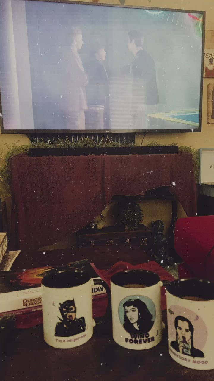 Spooky cute Wednesday Addams Cristina Ricci coffee & tea mug. This Addams Family Values design is done in retro mallcore, pastel goth style with hot pink, teal, and purple accents and a starry sky background. A pixel art baby bat hovers above Wednesday. This is a fun accessory for goth girls, horror fans, soft, and 80s/ 90s kids.
